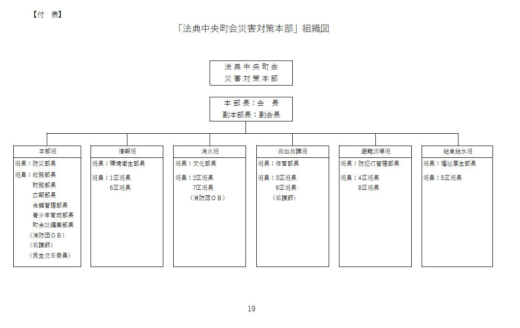 • 災害対策本部を法典中央町会会館に置く。地震等により法典中央町会